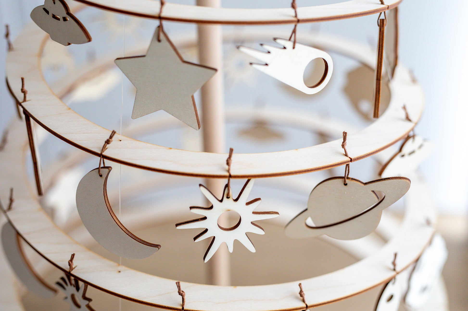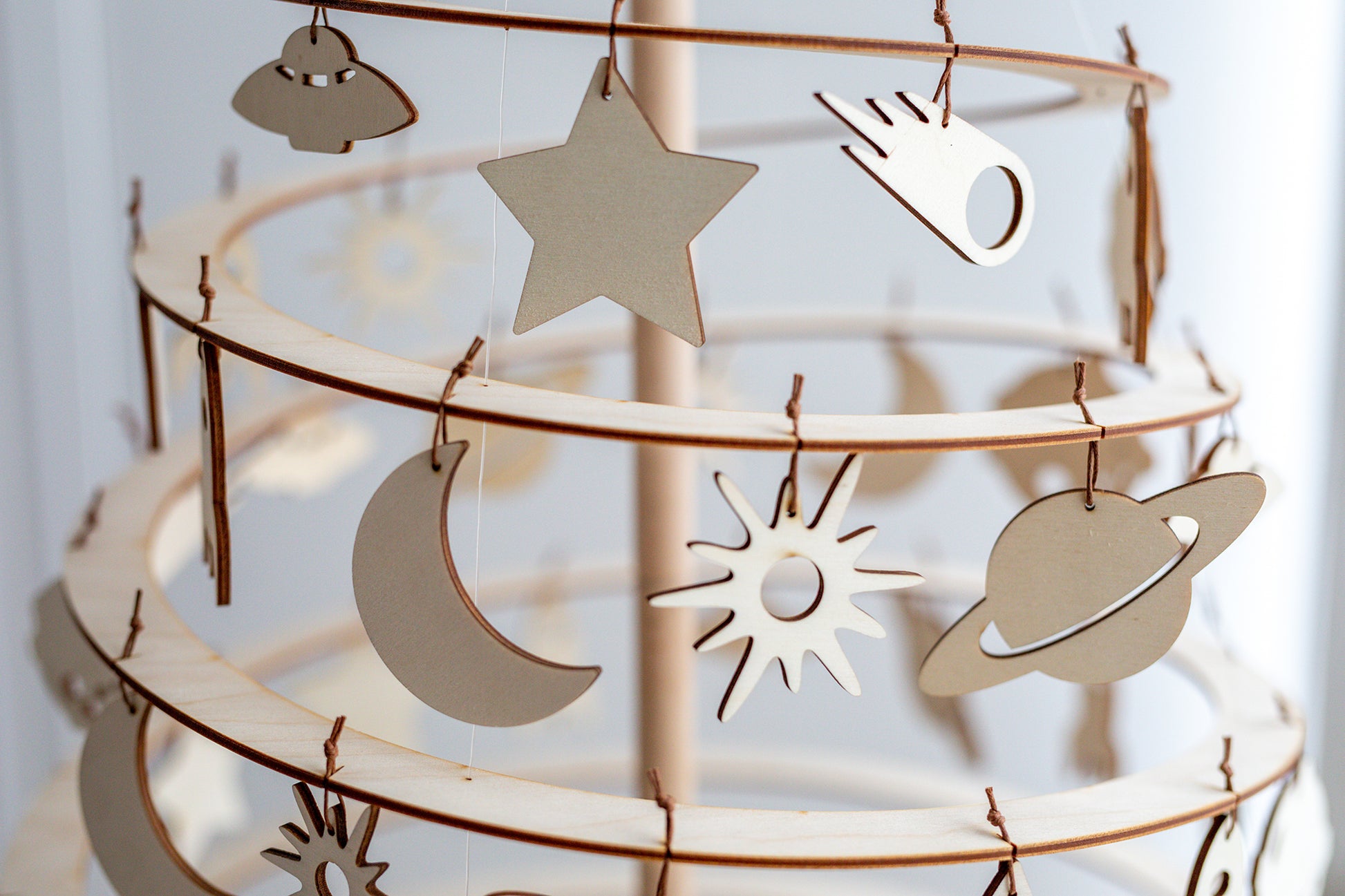 Zestaw drewnianych ozdób o różnorodnych kształtach o tematyce kosmicznej to doskonały wybór do wnętrz nowoczesnych i klasycznych. Ponadczasowy design i ciepło drewna zapewniają idealną świąteczną dekorację każdego domu.