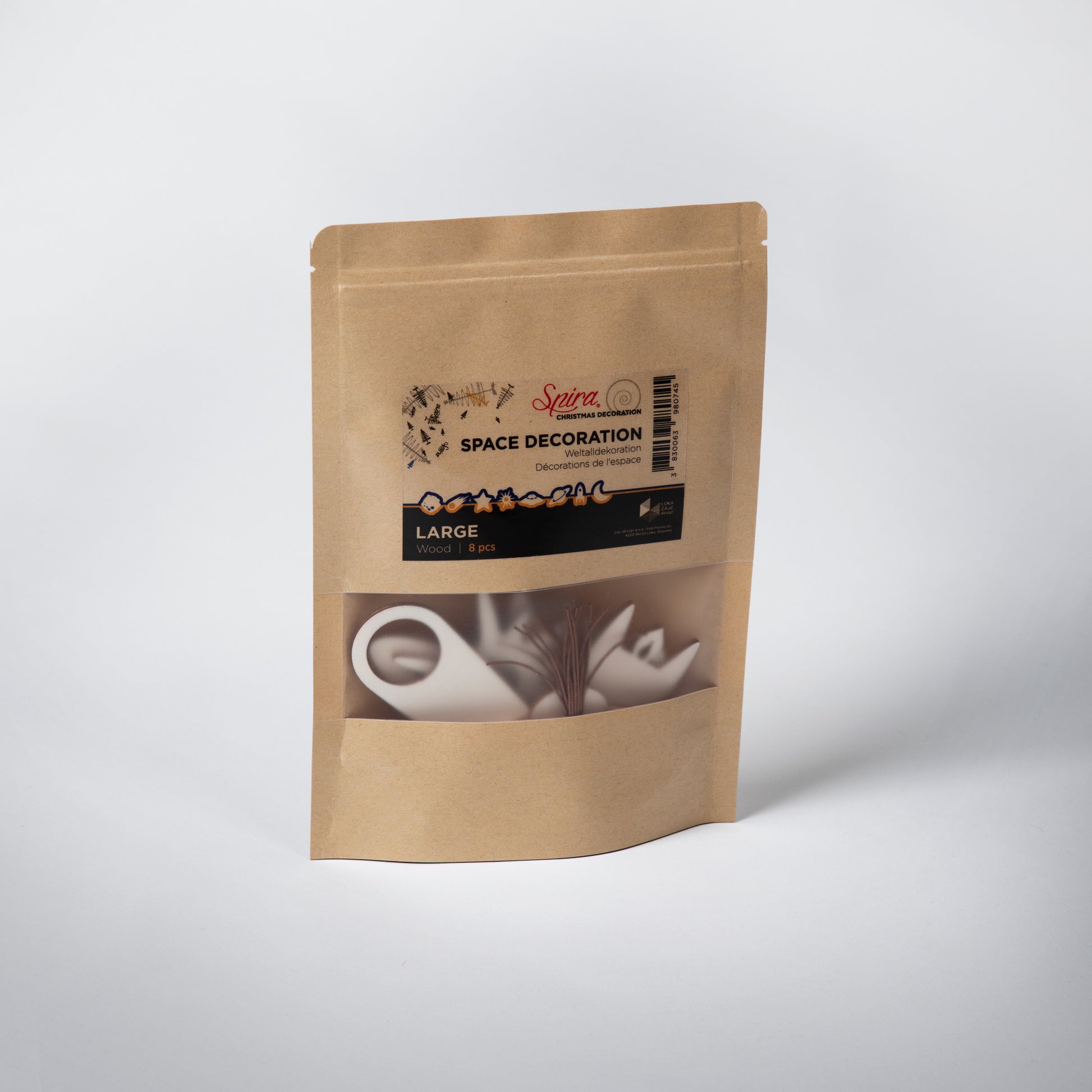 Zestaw zawiera 8 filcowych ozdób o motywach kosmicznych. Ozdoby dostępne są w trzech różnych rozmiarach. W zestawie znajdują się również sznurki do zawieszenia dekoracji.