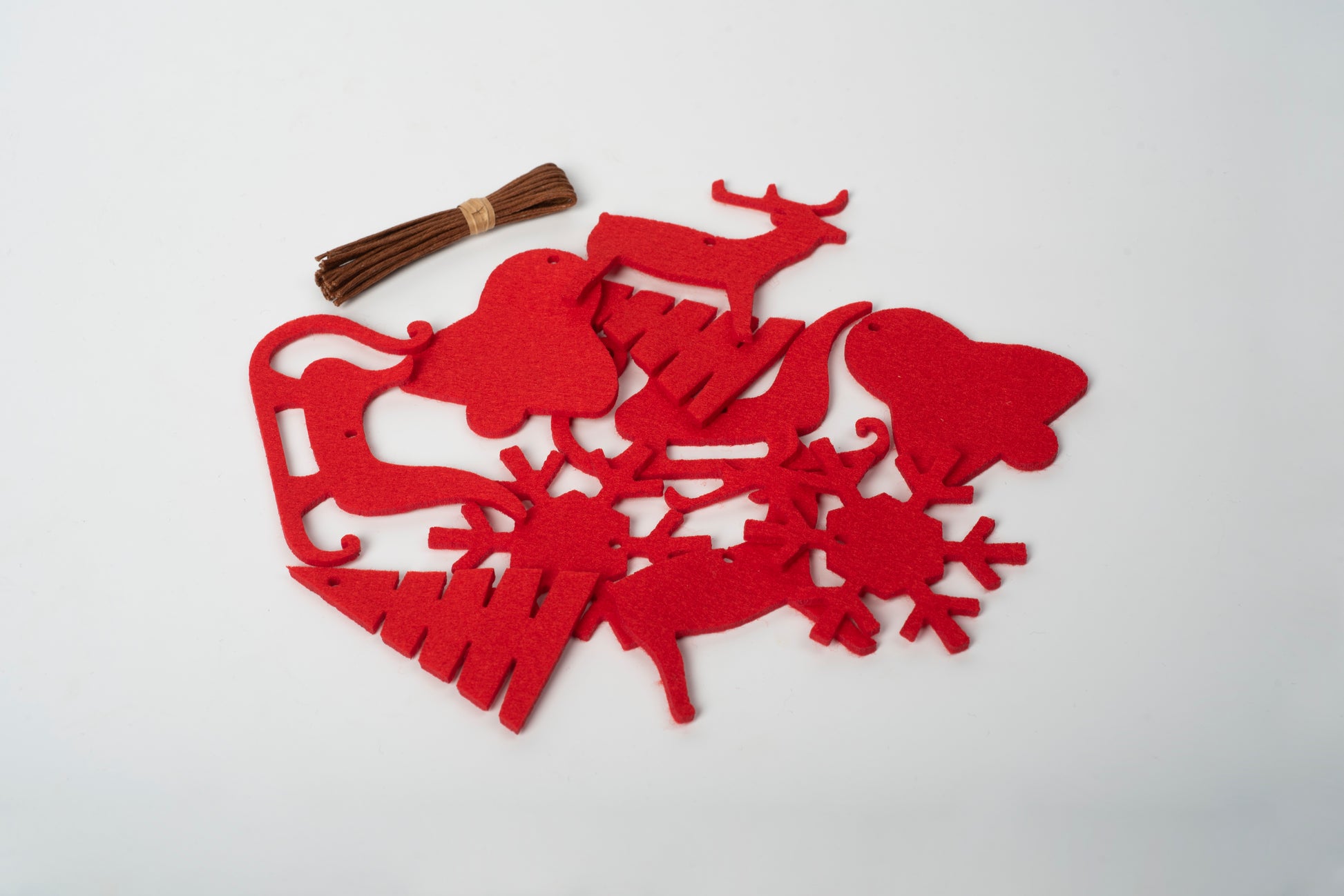 Zestaw zawiera 10 filcowych ozdób w 5 popularnych motywach bożonarodzeniowych. Ozdoby dostępne są w trzech różnych rozmiarach. W zestawie znajdują się również sznurki do zawieszenia dekoracji.